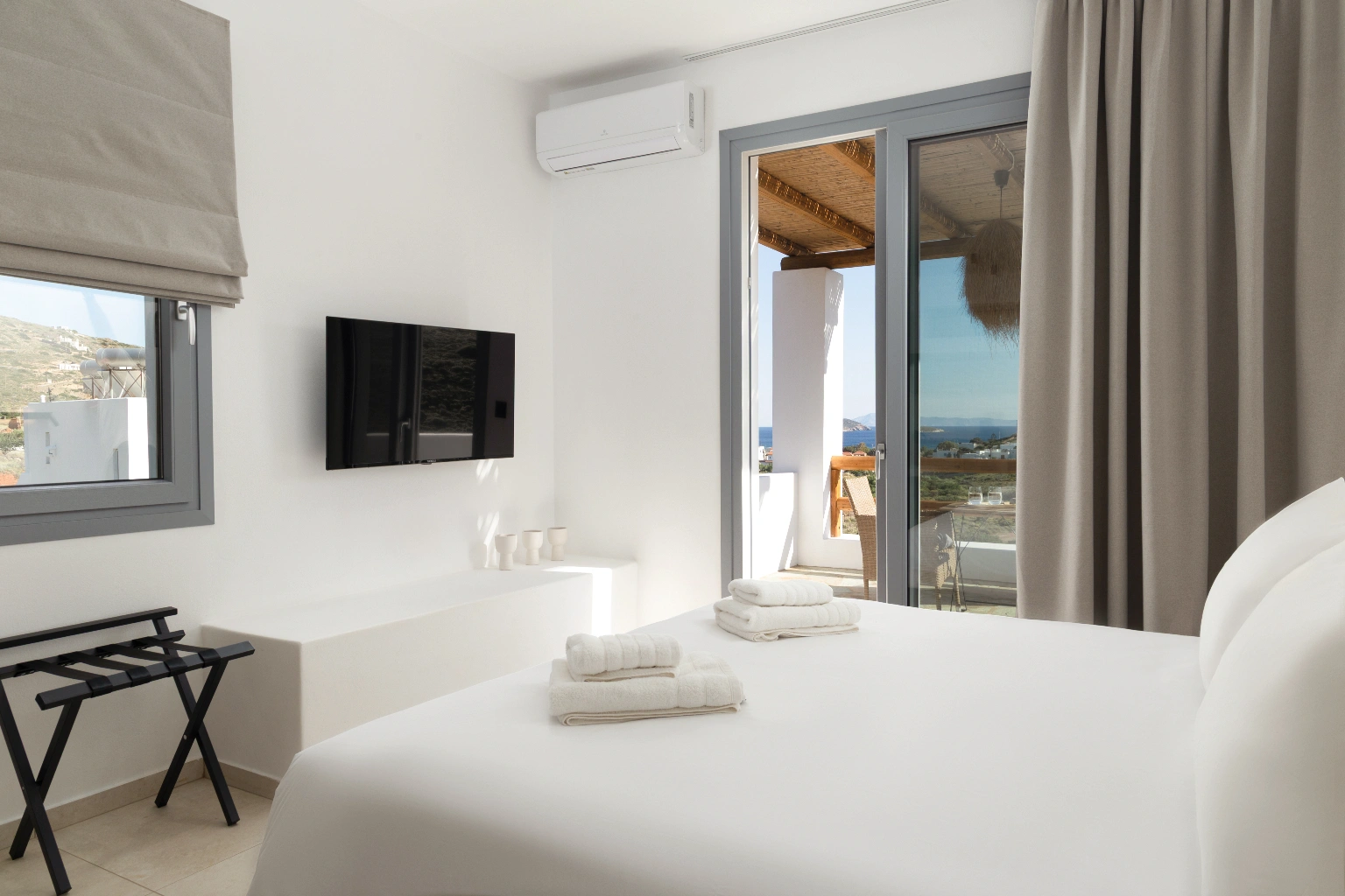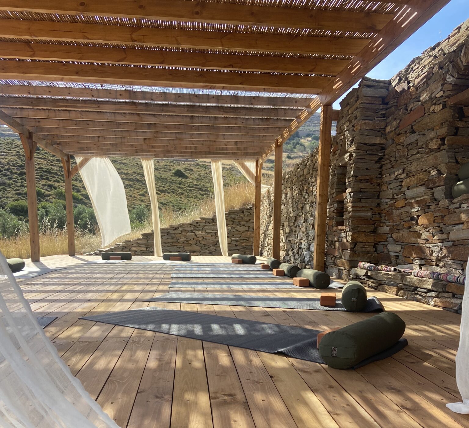 The outdoor practice deck sits beside the accommodation, allowing the sound of the waves and the Cycladic breeze to accompany every Yoga and Pilates session.